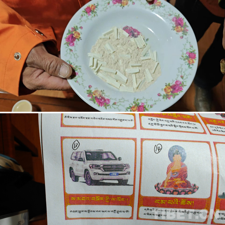 為了增添一些節(jié)日的氣氛,幾位道班大哥為我們準(zhǔn)備了別具特色的“抽簽”式古突。大家從盤子里抽取印有數(shù)字的標(biāo)簽紙,然后根據(jù)數(shù)字從解析書里找出對應(yīng)的圖案和文字解釋,寓意著新年會(huì)有不同的收獲。兩位同事抽到了取火器和黃財(cái)神,解讀說是能干和發(fā)大財(cái)。而我抽到了一輛“霸道車”,道班大哥說意味著新的一年我能去周游世界。每抽完一個(gè)簽,大家都會(huì)叫好和鼓掌,給抽簽人送去美好的新年祝福。