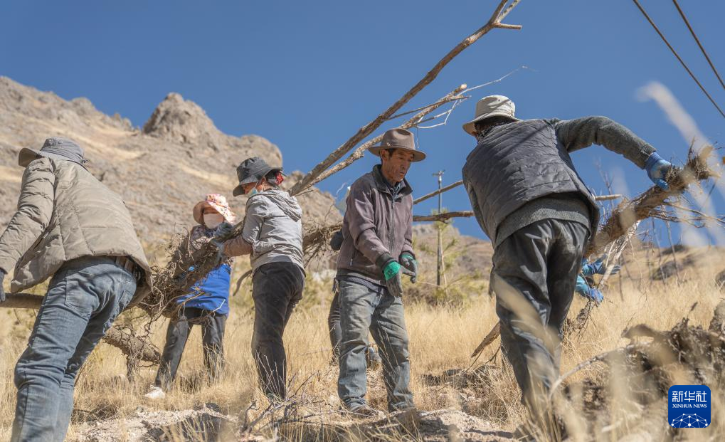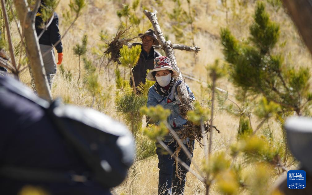 3月12日,東嘎社區(qū)二組村民在搬運(yùn)樹(shù)苗。新華社記者 晉美多吉攝 ??