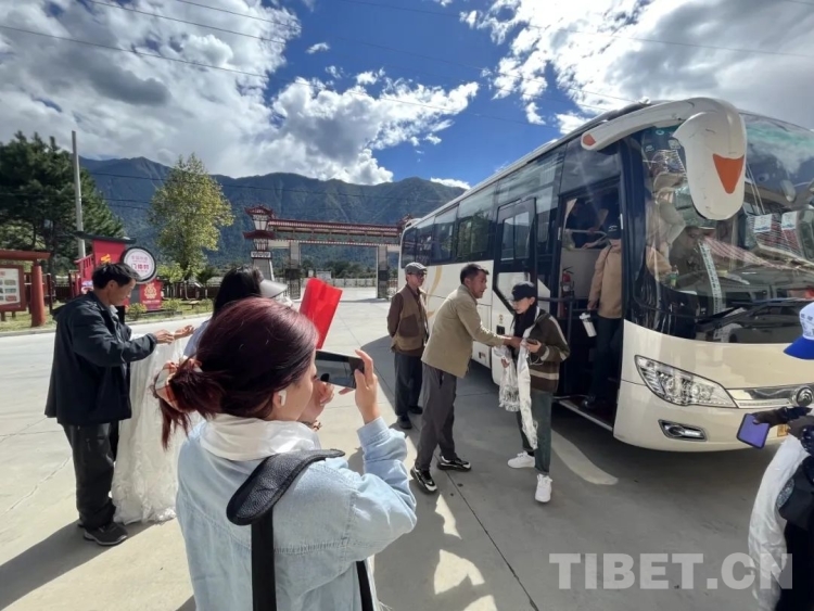 圖為門仲村工作人員為游客獻(xiàn)哈達(dá)表示歡迎