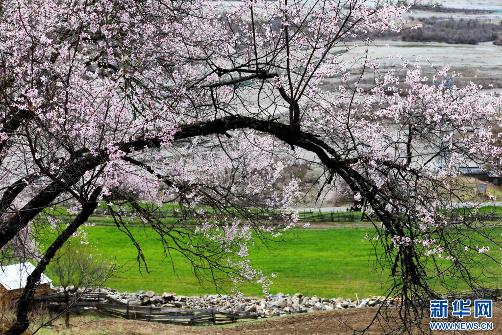 圖為西藏波密縣傾多鎮(zhèn)巴康村內(nèi),桃花映襯下的綠草。新華網(wǎng)發(fā) 阿旺仁青 攝