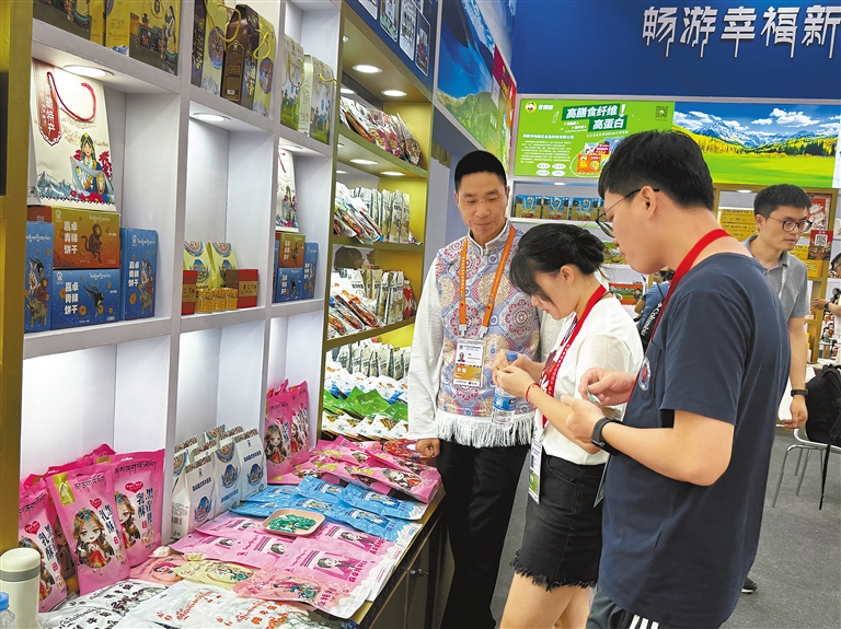 走進展館內(nèi),琳瑯滿目、色彩鮮艷的雪域高原特色產(chǎn)品整齊擺放在展館架上,吸引了眾多客商和顧客前來咨詢。