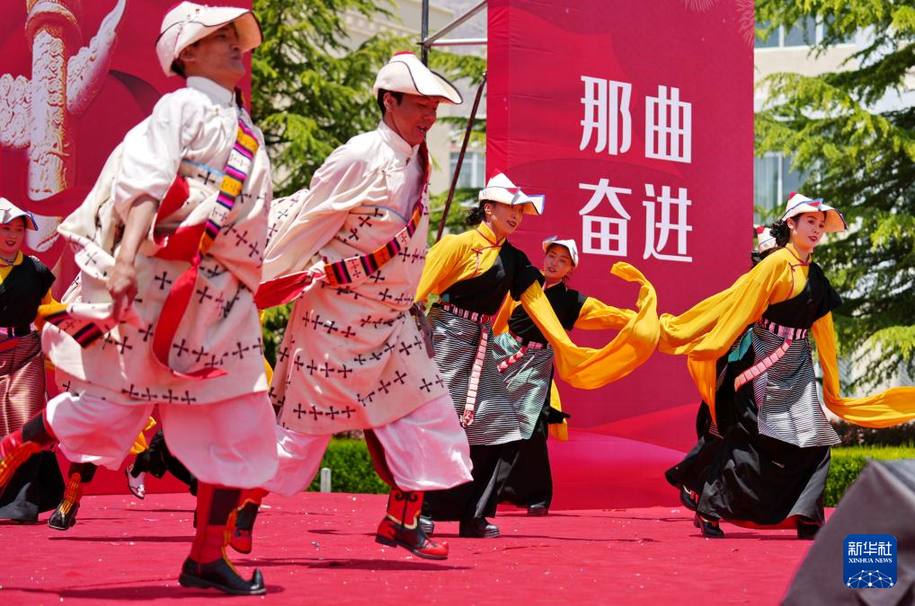 5月12日,在西藏職業(yè)技術(shù)學(xué)院職業(yè)教育活動(dòng)周啟動(dòng)儀式暨比如縣非物質(zhì)文化遺產(chǎn)進(jìn)校園活動(dòng)上,比如縣民族藝術(shù)團(tuán)的演職人員在表演節(jié)目。新華社發(fā)(趙大志攝) ??