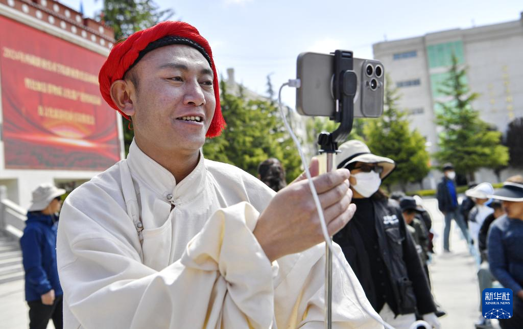 ?5月12日,在西藏職業(yè)技術(shù)學(xué)院職業(yè)教育活動(dòng)周啟動(dòng)儀式暨比如縣非物質(zhì)文化遺產(chǎn)進(jìn)校園活動(dòng)上,來自比如縣的一名旅游推介者在做現(xiàn)場直播。新華社記者 張汝鋒 攝 ??