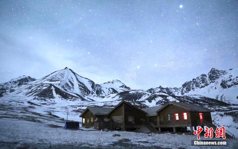 近日,記者嘗試攀登了白雪皚皚的青海省海北藏族自治州門源回族自治縣境內(nèi)的崗什卡雪峰。崗什卡雪峰面積約450平方公里,又稱“冷龍嶺”,是祁連山主峰之一,海拔在4000米—5000米之間,海拔4500米以上多有現(xiàn)代冰川,冰川總面積約80平方公里。圖為晚間的崗什卡雪峰露營(yíng)基地。陳宏年 攝