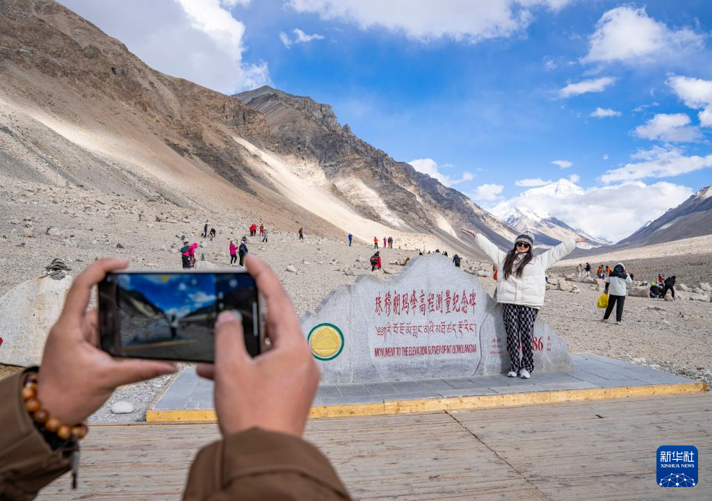 游客在珠穆朗瑪峰高程測量紀念碑前拍照留念(5月24日攝)。新華社記者 孫非 攝