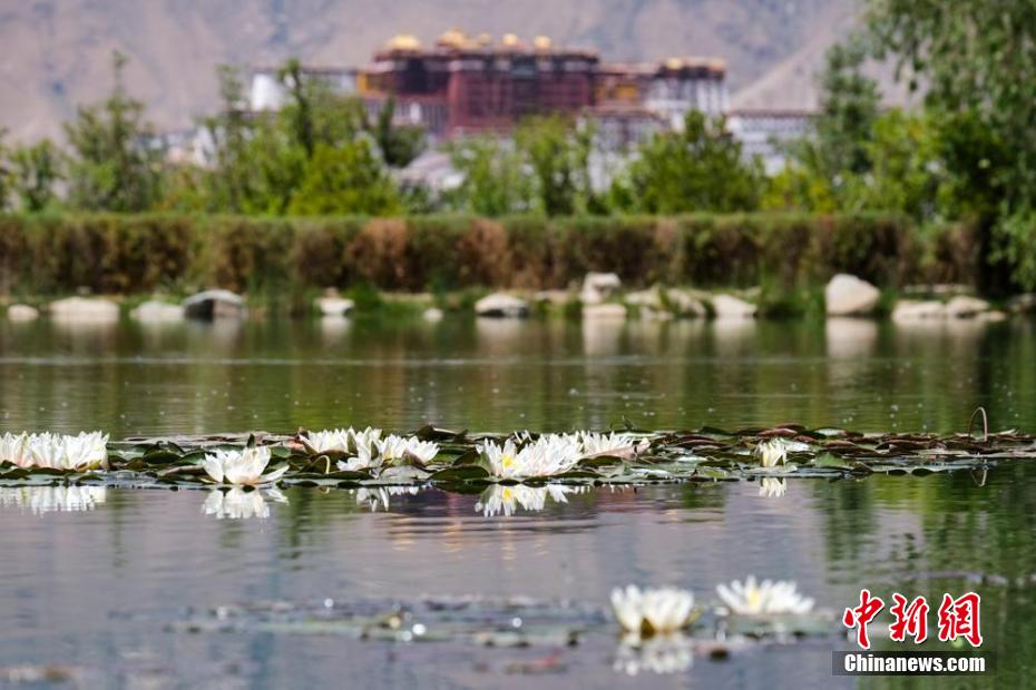 5月28日,拉薩南山公園人工湖中的睡蓮和遠處的布達拉宮。