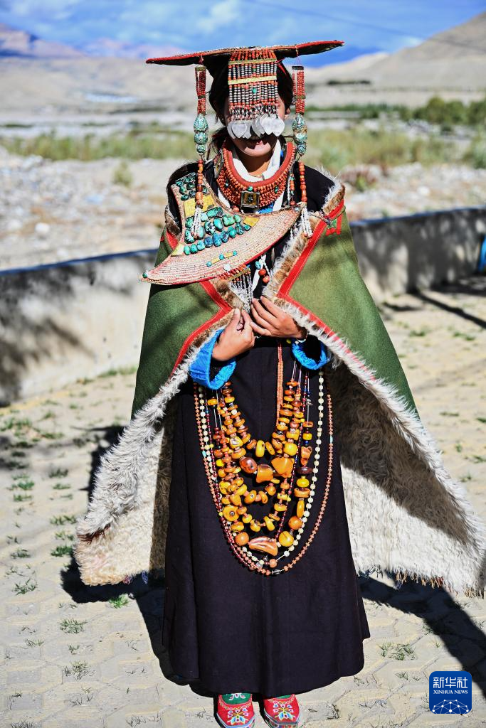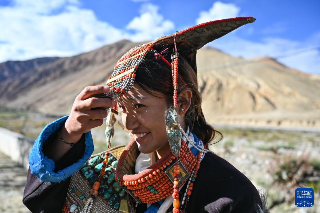 9月9日,在西藏阿里地區(qū)普蘭縣科迦村,村民展示普蘭服飾。新華社記者 孫瑞博 攝