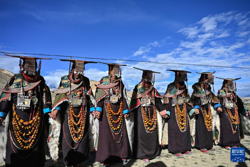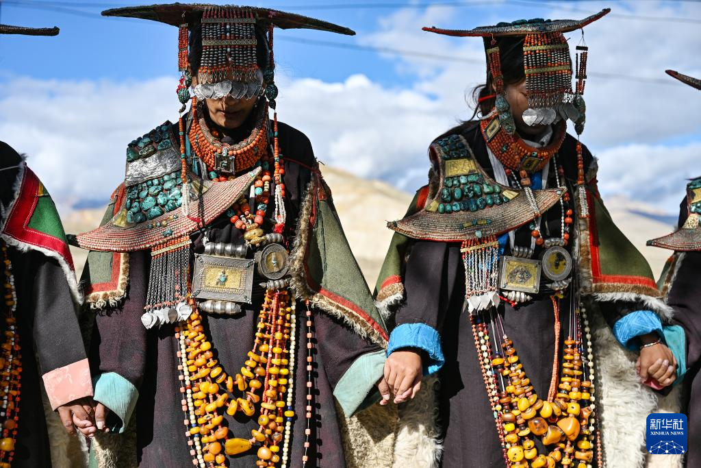 9月9日,在西藏阿里地區(qū)普蘭縣科迦村,村民身著普蘭服飾表演宣舞。新華社記者 孫瑞博 攝 ??