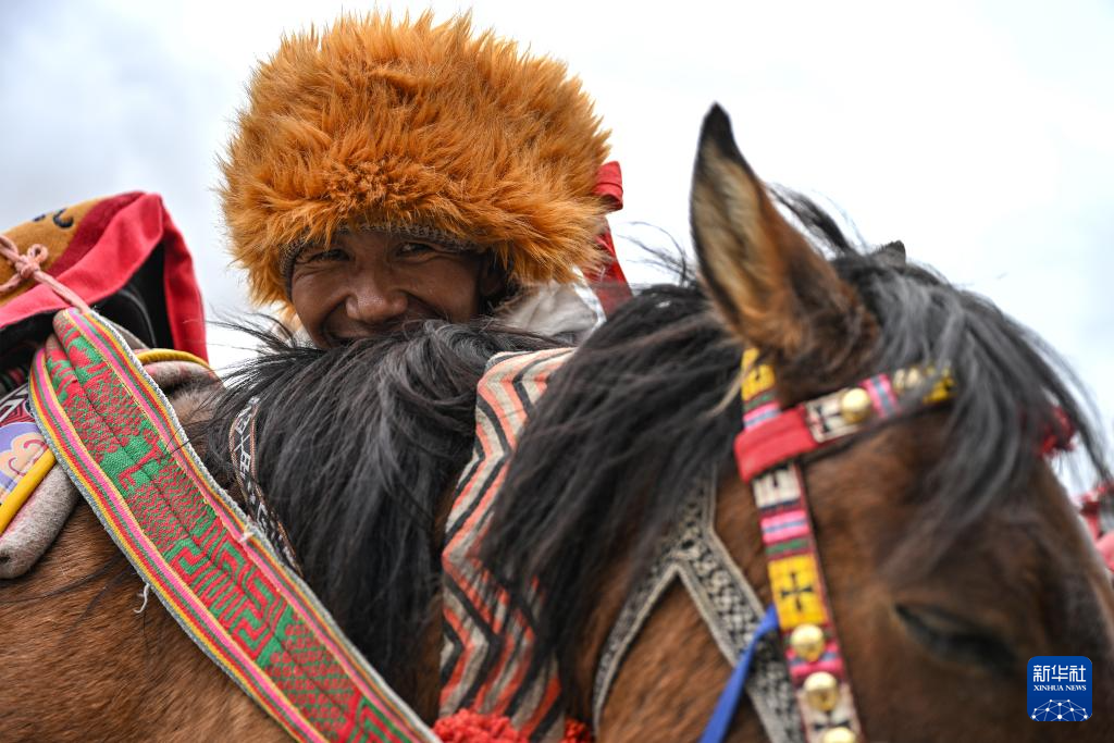 9月8日,在普蘭縣巴嘎鄉(xiāng)崗莎村,當(dāng)?shù)卮迕裾隣恐R和游客同行。新華社記者孫瑞博 攝