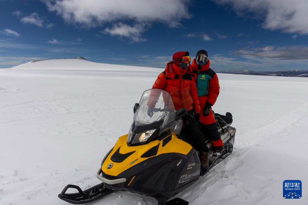 9月12日,科考隊員在雪地摩托上商量前往其他作業(yè)點的路線。新華社記者 姜帆 攝 ??