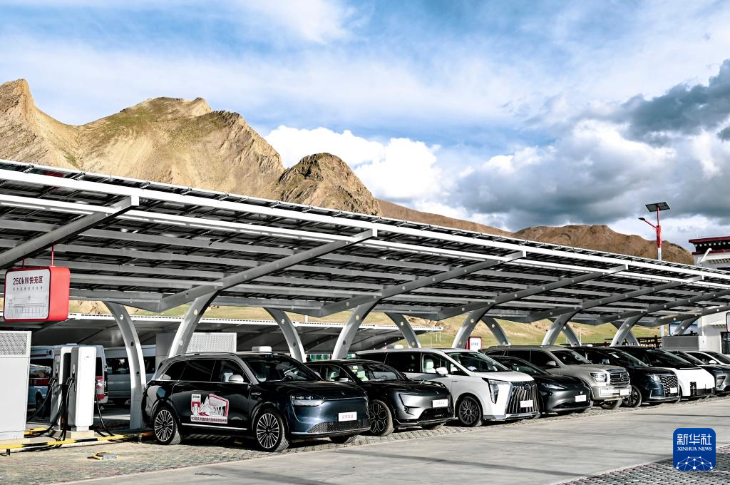 9月2日拍攝的日喀則市珠穆朗瑪國家公園北大門停車場內(nèi)的珠峰光儲液冷超充站。新華社發(fā) ??