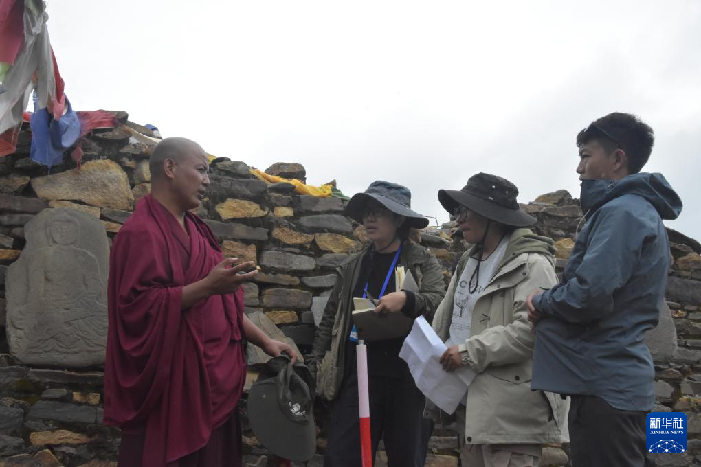 普查隊員正在向了解當?shù)貧v史文化的僧人咨詢塔巴遺址歷史沿革。新華社記者 春拉 攝