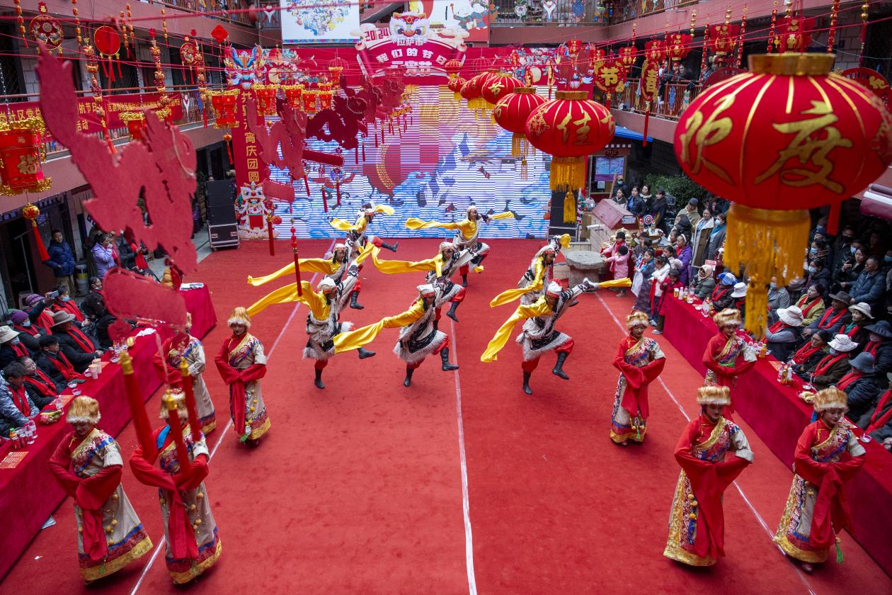 圖為元宵節(jié)期間拉薩市城關(guān)區(qū)雪巴拉姆藝術(shù)團(tuán)的演員在拉薩德賽大院里表演。新華網(wǎng) 旦增努布 攝