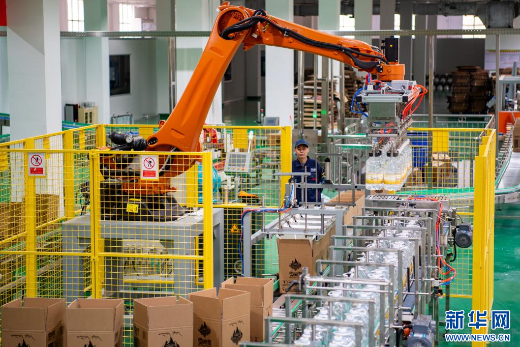 10月21日拍攝的江達(dá)縣凈界天然飲用水有限責(zé)任公司的產(chǎn)品生產(chǎn)流水線。該公司依托當(dāng)?shù)睾0?500米的天然涌泉,打造天然飲用水。新華網(wǎng) 旦增努布 攝