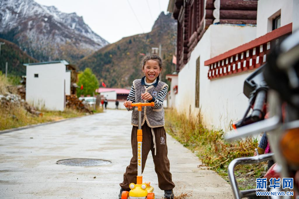10月19日,小朋友在昌都市卡若區(qū)妥壩鄉(xiāng)熱霍村整潔的道路上玩耍。新華網(wǎng) 旦增努布 攝