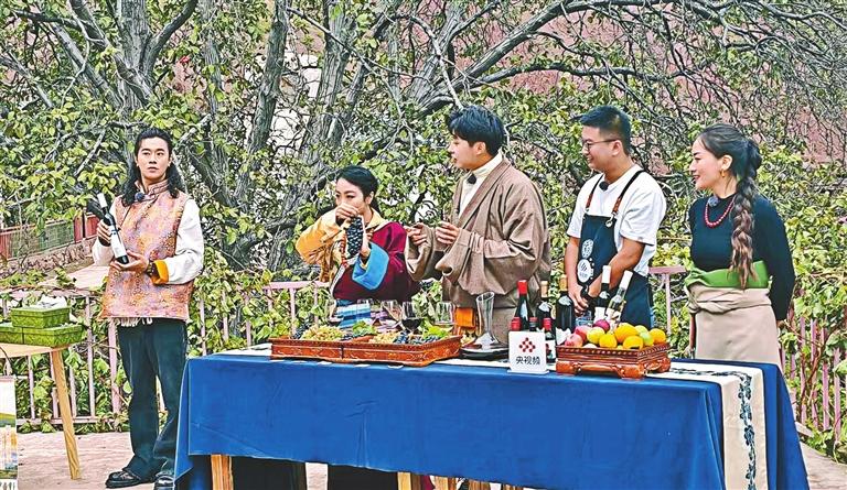 穿過湖邊棧道,探訪團在棧道涼亭,品嘗人參果、風干牦牛肉、藏雞、霍爾巴羊……仿佛只需要用味蕾,就能描摹出這片土地的質(zhì)樸。
