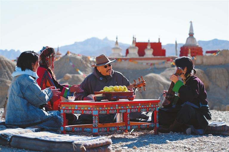 在參觀古格紅殿時,探訪團發(fā)現(xiàn)壁畫中出現(xiàn)了很多種樂器,其中的果沃琴等樂器至今還在阿里地區(qū)流行。從對古格王朝遺址的歷史沉思中走出,探訪團在古格山腳下體驗了當?shù)貍鹘y(tǒng)民族樂器,觀看了阿里首部歷史情景劇《夢回古格》中的宣舞選段,演員們的傾情表演,讓探訪團一睹紅殿壁畫中的“現(xiàn)實版”宣舞。