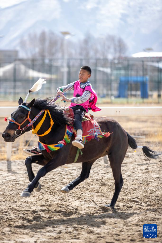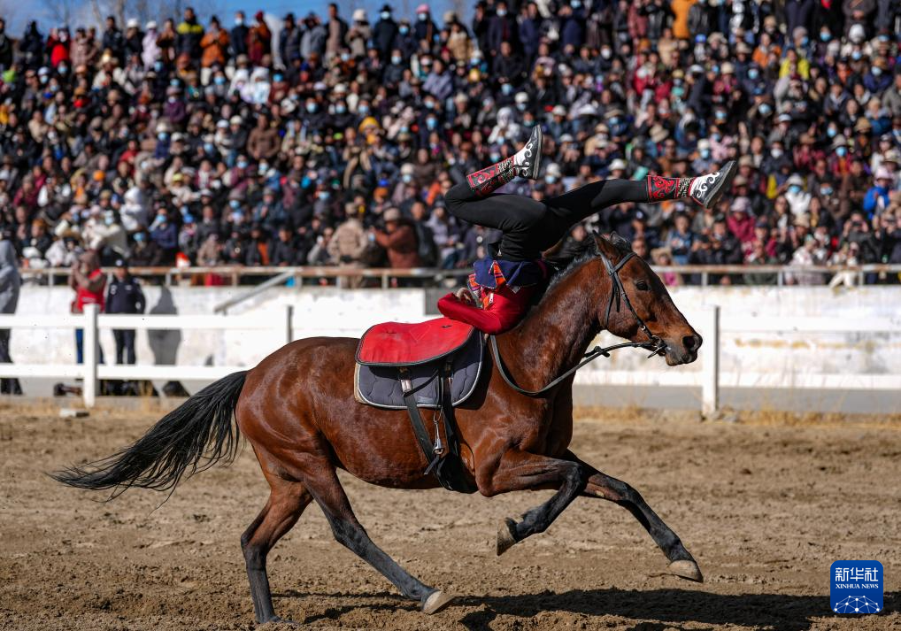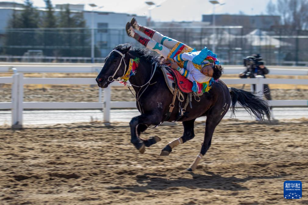 3月2日,馬術(shù)隊(duì)員在表演傳統(tǒng)馬術(shù)項(xiàng)目。新華社記者 晉美多吉 攝??