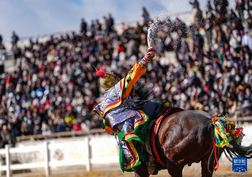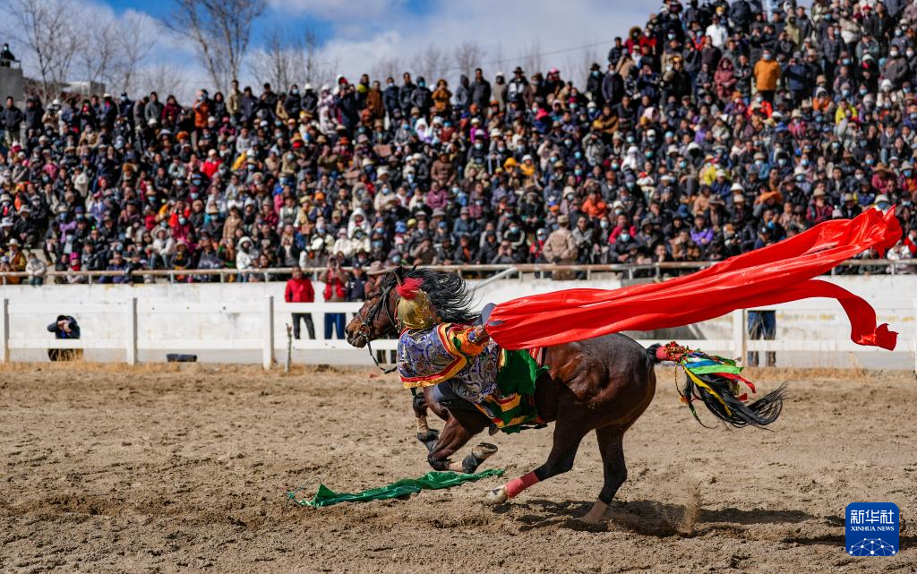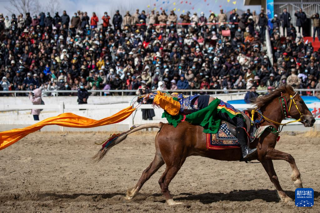 3月2日,馬術(shù)隊(duì)員在表演傳統(tǒng)馬術(shù)項(xiàng)目撿哈達(dá)。新華社記者 晉美多吉 攝?