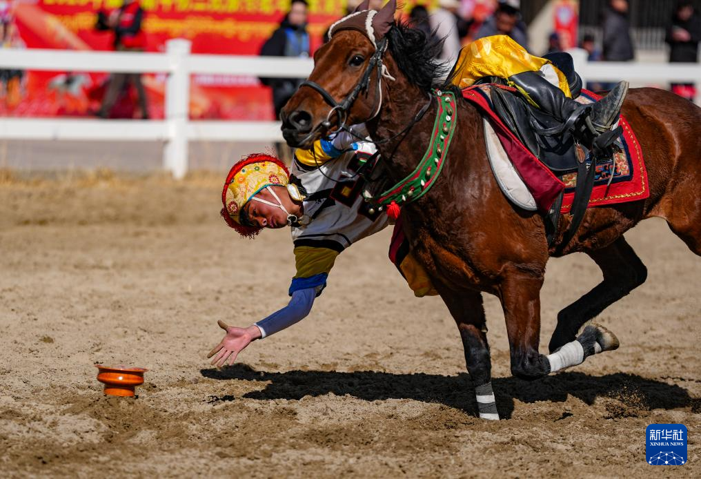 3月2日,馬術(shù)隊(duì)員在表演傳統(tǒng)馬術(shù)項(xiàng)目撿碗。新華社記者 晉美多吉 攝??