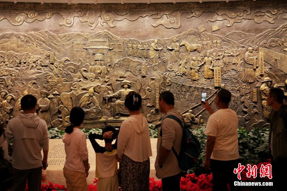 7月15日,在位于西藏拉薩的西藏博物館,觀眾參觀西藏歷史畫卷浮雕。據了解,西藏博物館設有基本陳列《雪域長歌—西藏歷史文化展》《離太陽最近的人—西藏民俗文化展》,充分展示西藏地區(qū)歷史發(fā)展進程與文化面貌。中新社記者 張祥毅 攝