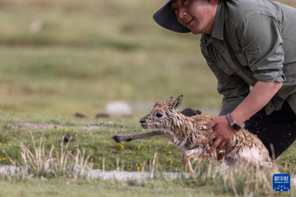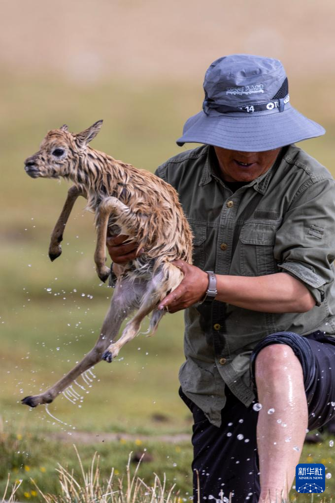 管護隊員次旺在救助一只被激流沖走的藏羚羊幼崽(7月14日攝)。新華社記者 姜帆 攝 ??