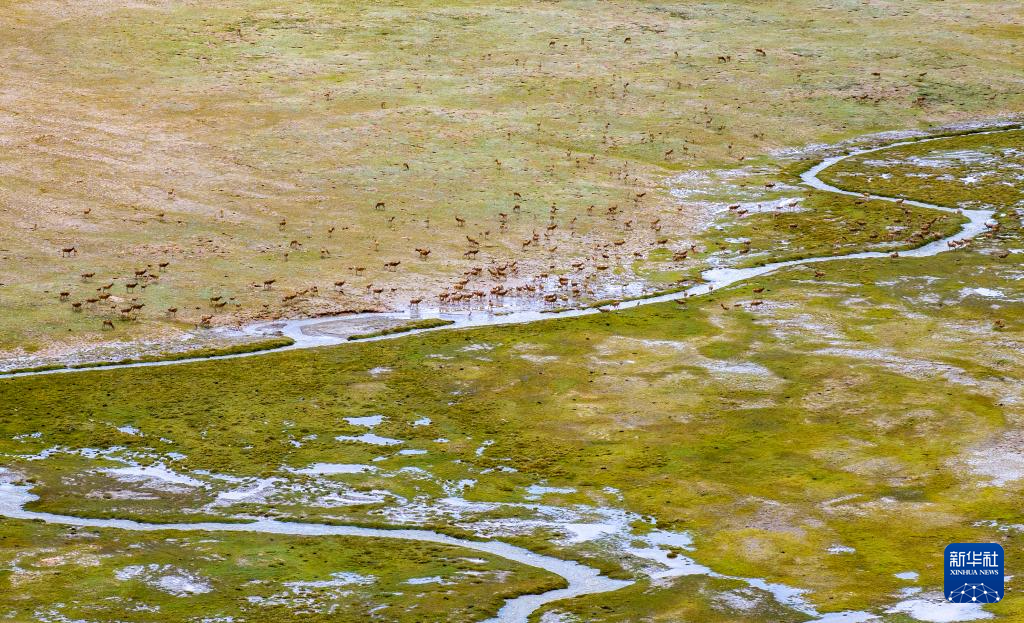 一群帶著幼崽的藏羚羊成功渡過森隆藏布河,正在往族群日常棲息地遷徙(7月16日攝)。新華社記者 姜帆 攝?