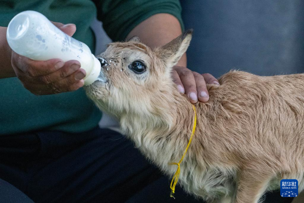 措羅木管理站站長阿旺洛卓在給藏羚羊幼崽喂奶(7月16日攝)。新華社記者 姜帆 攝?