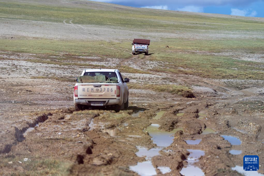 措羅木管理站的野生動物管護員驅車前往無人區(qū)深處的森隆藏布河畔(7月14日攝)。新華社記者 姜帆 攝