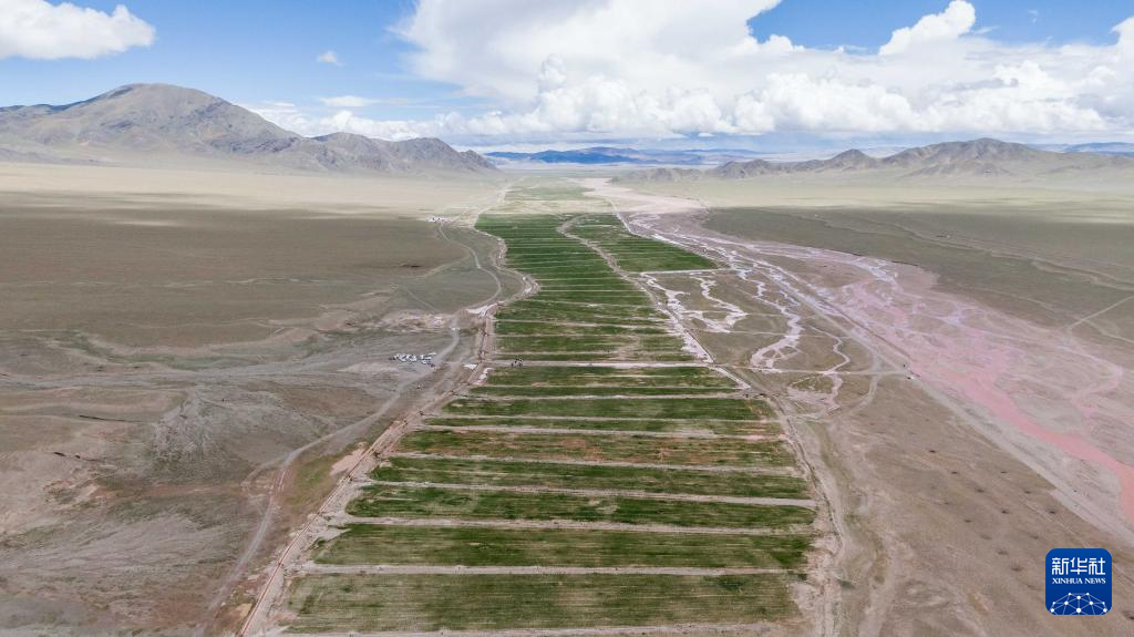 西藏阿里地區(qū)革吉縣文布當(dāng)桑鄉(xiāng)人工種草基地一景(7月20日攝,無人機(jī)照片)。新華社記者 旦增尼瑪曲珠 攝 ??