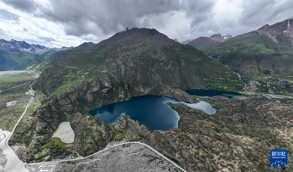 空中俯瞰“三色湖”,從左到右分別為黃湖、黑湖和白湖(7月20日攝,無人機(jī)照片)。新華社記者 晉美多吉 攝