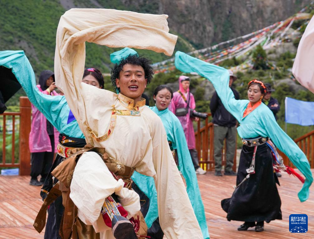 邊壩縣普玉一村的文藝隊(duì)演員在“三色湖”觀景臺(tái)上為游客表演鍋莊(7月20日攝)。新華社記者 晉美多吉 攝 ??