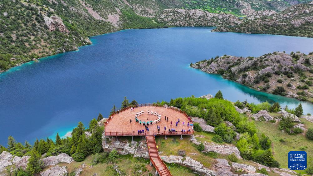 邊壩縣普玉一村的文藝隊(duì)演員在“三色湖”觀景臺(tái)上為游客表演鍋莊(7月20日攝,無人機(jī)照片)。新華社記者 晉美多吉 攝