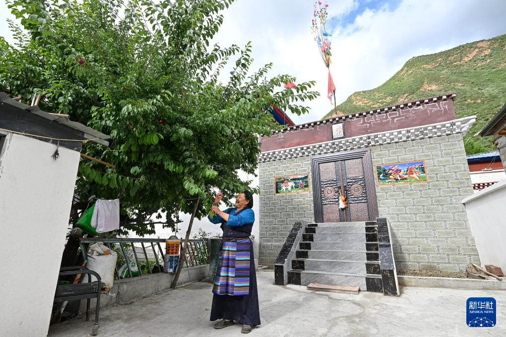 7月21日,63歲的拉丁雪村村民索朗康珠在改造提升后的自家小院內(nèi)摘李子。新華社記者 李鑫 攝 ??