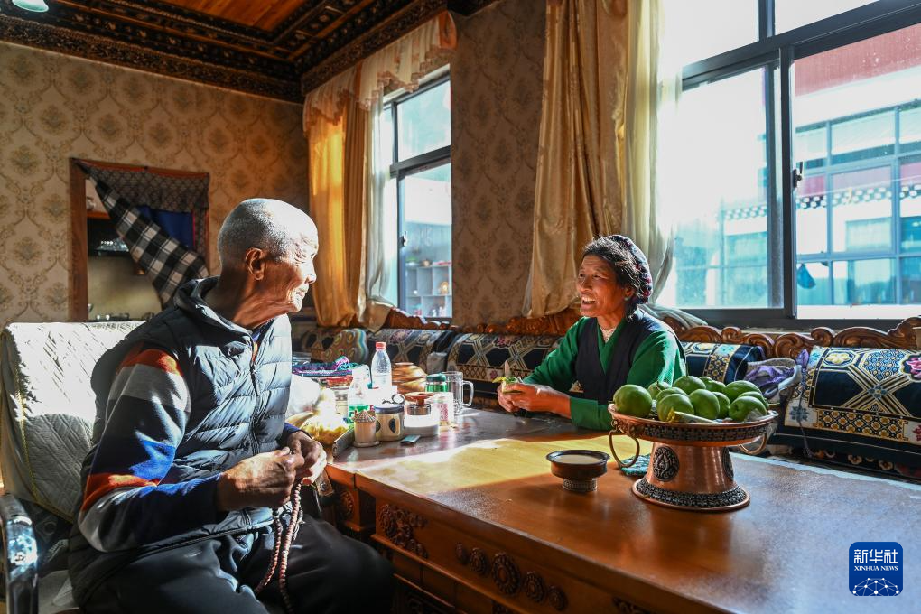 7月21日,58歲的拉丁雪村婦聯(lián)主席格桑德青(右)在自家改造提升后的餐廳里給88歲的父親喬多吉削水果。新華社記者 李鑫 攝 ??
