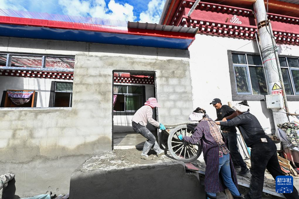 7月21日,51歲的拉丁雪村村民次旺羅布(右二)在村民的幫助下運輸建筑材料,改造提升自己的房屋。新華社記者 李鑫 攝 ??