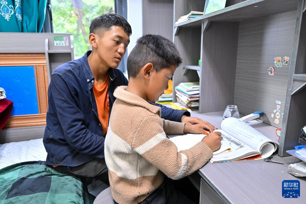 7月21日,17歲的米瑪次仁(左)在新房臥室內(nèi)輔導7歲的弟弟堅阿達瓦寫作業(yè)。新華社記者 李鑫 攝 ??