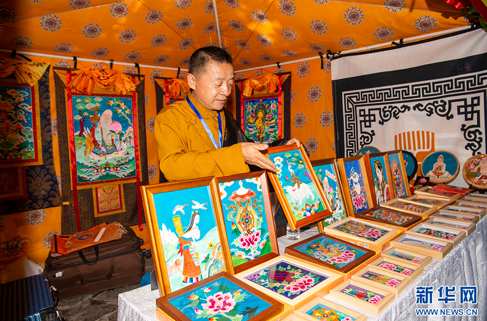 7月26日,來(lái)自青海的熱貢藝術(shù)(堆繡)代表性傳承人夏吾當(dāng)周在介紹特色文創(chuàng)產(chǎn)品。新華網(wǎng) 旦增努布 攝