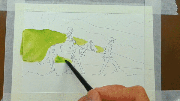 展開畫紙,最先捕捉到的是夏日魯朗層次豐富的綠意:嫩綠的草地鋪展開來,湖水映出清澈的藍(lán)綠色澤,遠(yuǎn)處的山巒泛著淡淡青色,層層疊疊。道路在明媚的陽光下,潔白如雪,在綠色中蜿蜒,串聯(lián)起一個(gè)個(gè)藏式村落。