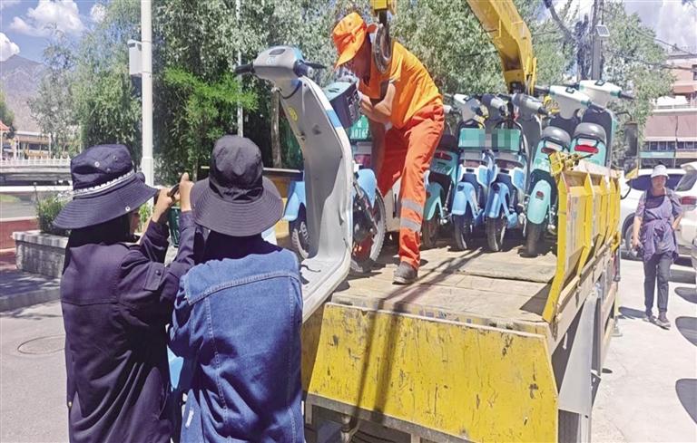 工作人員督促企業(yè)調(diào)離轄區(qū)超量共享電動(dòng)車。圖由城關(guān)區(qū)城管局提供