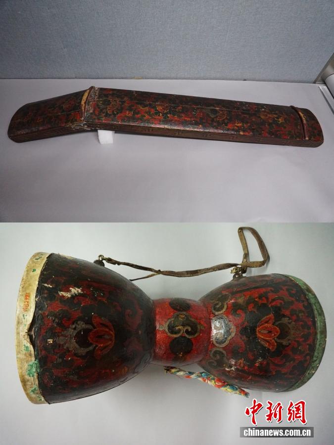 唐朝文成公主帶到吐蕃的琴與長(zhǎng)鼓。 北京民族文化宮供圖