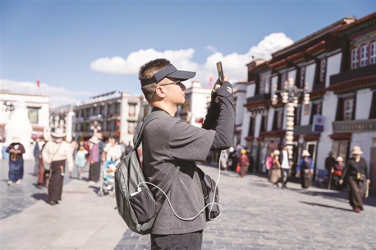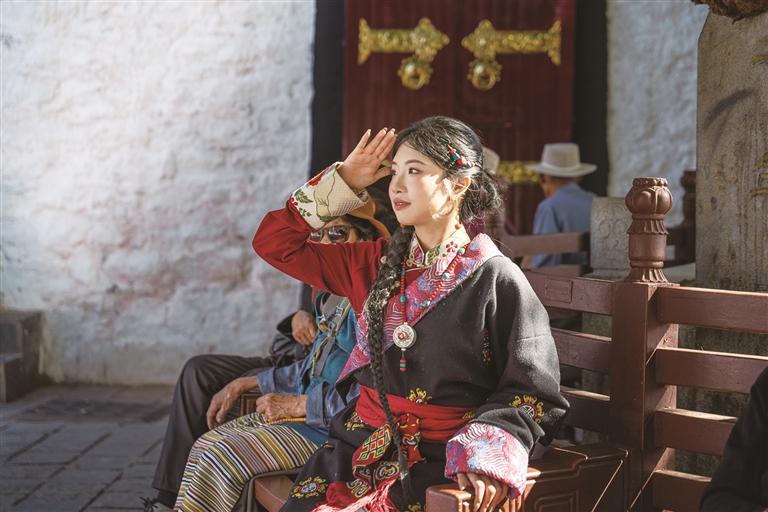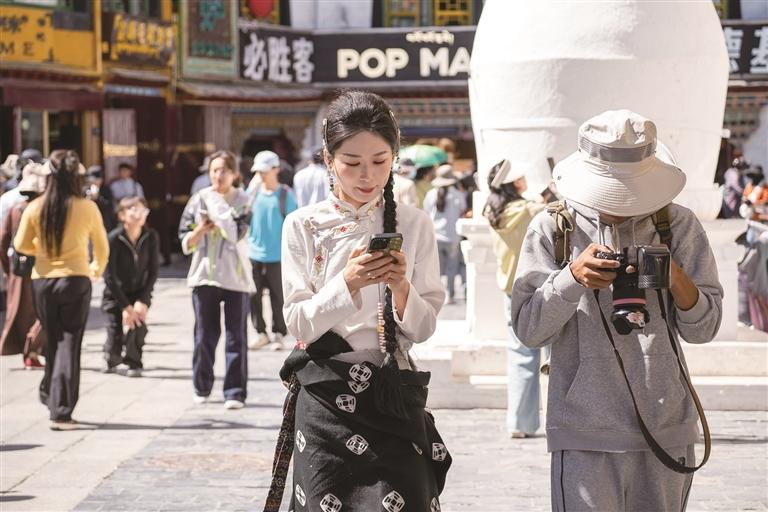 街巷里,來自五湖四海的游客們開始穿梭在八廓街蜿蜒曲折的街巷中。他們滿懷好奇,感受著這里獨(dú)特的風(fēng)土人情。不少游客興致勃勃地穿上一套精美的藏裝,搖身一變成為高原上美麗的“卓瑪”與帥氣的“扎西”。他們?cè)诠沤值拿恳粋€(gè)角落留下自己的身影,臉上洋溢著對(duì)這片土地的喜愛與贊嘆。