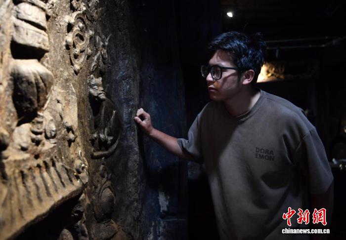 鄉(xiāng)城縣宗薩木府的主人洛絨澤仁介紹藏式香巴拉貓泥塑?!∮浾?王磊 攝