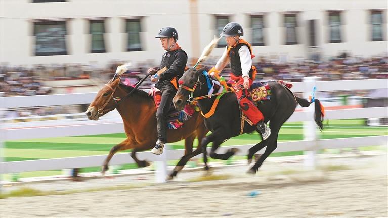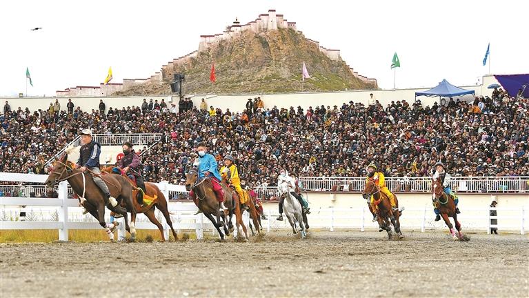 “達(dá)瑪”藏語意為“跑馬射箭”。每年的達(dá)瑪節(jié),賽馬都會(huì)吸引十里八鄉(xiāng)的人們前來觀賽。賽馬場(chǎng)上人頭攢動(dòng),隨著發(fā)令聲響,一匹匹駿馬如離弦之箭沖出起跑線,騎手俯身貼在馬背上,揚(yáng)鞭馳騁,你追我趕,奮勇爭先。觀眾席上,人們隨著比賽節(jié)奏,時(shí)而激動(dòng),時(shí)而安靜,時(shí)而歡呼,時(shí)而嘆息。藏族阿媽次仁卓嘎難掩激動(dòng),她告訴記者,幾乎每年都會(huì)和家人來看賽馬。賽場(chǎng)上,選手們堅(jiān)韌不拔、昂揚(yáng)向上的精神風(fēng)貌讓人動(dòng)容,也激勵(lì)著一代又一代英雄城兒女為祖國發(fā)展繁榮而不懈奮斗。