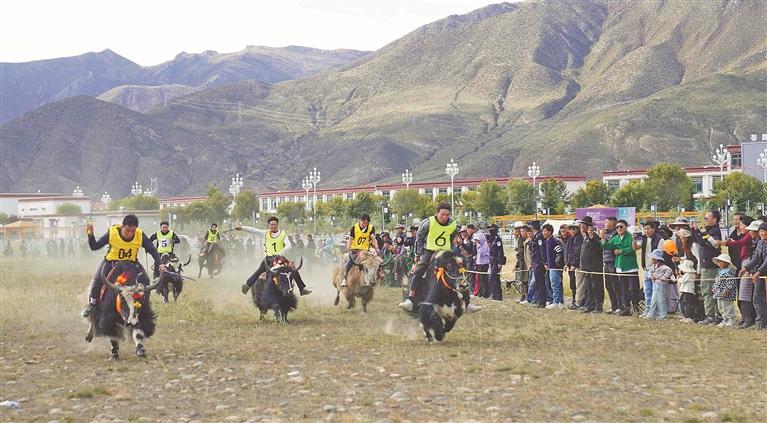 10月1日,拉薩市墨竹工卡縣賽牛場(chǎng)舉辦獨(dú)具特色的牦牛競(jìng)速賽,為游客和群眾呈現(xiàn)了一場(chǎng)力量與速度的較量。圖為激烈的比賽現(xiàn)場(chǎng)。記者 格桑倫珠 攝