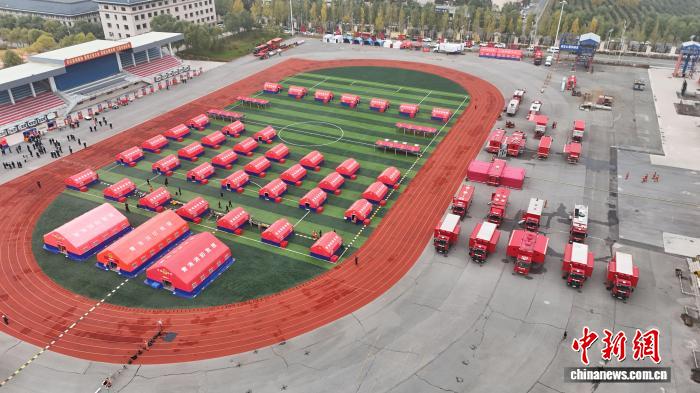 圖為航拍青藏高原大震巨災(zāi)救援協(xié)作區(qū)交流聯(lián)合演練現(xiàn)場。 青海消防供圖