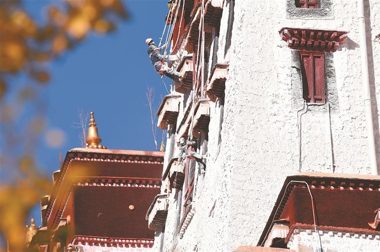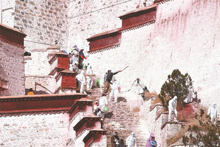 10月22日,拉薩布達拉宮迎來一年一度的粉刷季,人們手持工具,將涂料逐層涂刷在布達拉宮墻上。據(jù)了解,布達拉宮刷墻涂料主要以白灰、紅土和黃土等天然原料為主,為了增加光澤和黏度,調配過程中還會添加少量的牛奶、白糖、蜂蜜、藏紅花和牛骨膠等,讓涂料更好地附著在墻體上,為布達拉宮的墻體增添一層保護。記者 洛桑 唐斌 攝影報道