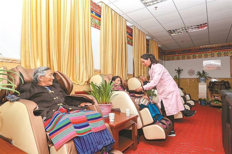 圖為阿里地區(qū)雙集中供養(yǎng)中心里,老人們?cè)诒=±懑熓疫M(jìn)行按摩保健。記者 格桑吉美 攝(資料圖片)