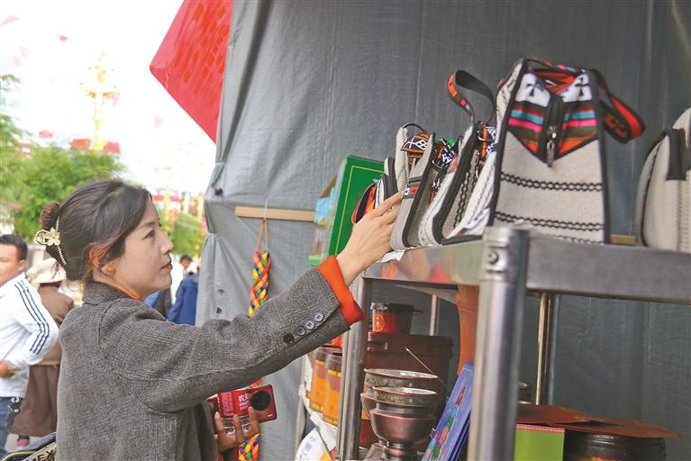 圖為曲松縣農(nóng)產(chǎn)品展銷活動中,具有當(dāng)?shù)靥厣氖止ぞ幙棶a(chǎn)品深受青睞。記者 丹增平措 攝