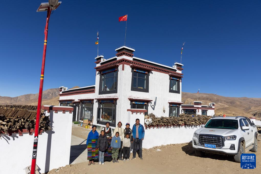 西藏定日縣曲洛鄉(xiāng)措昂村村民達(dá)瓦卓瑪(后中)一家在新房前準(zhǔn)備拍攝“全家?!保?0月27日攝)。新華社發(fā)(陳小軍攝)